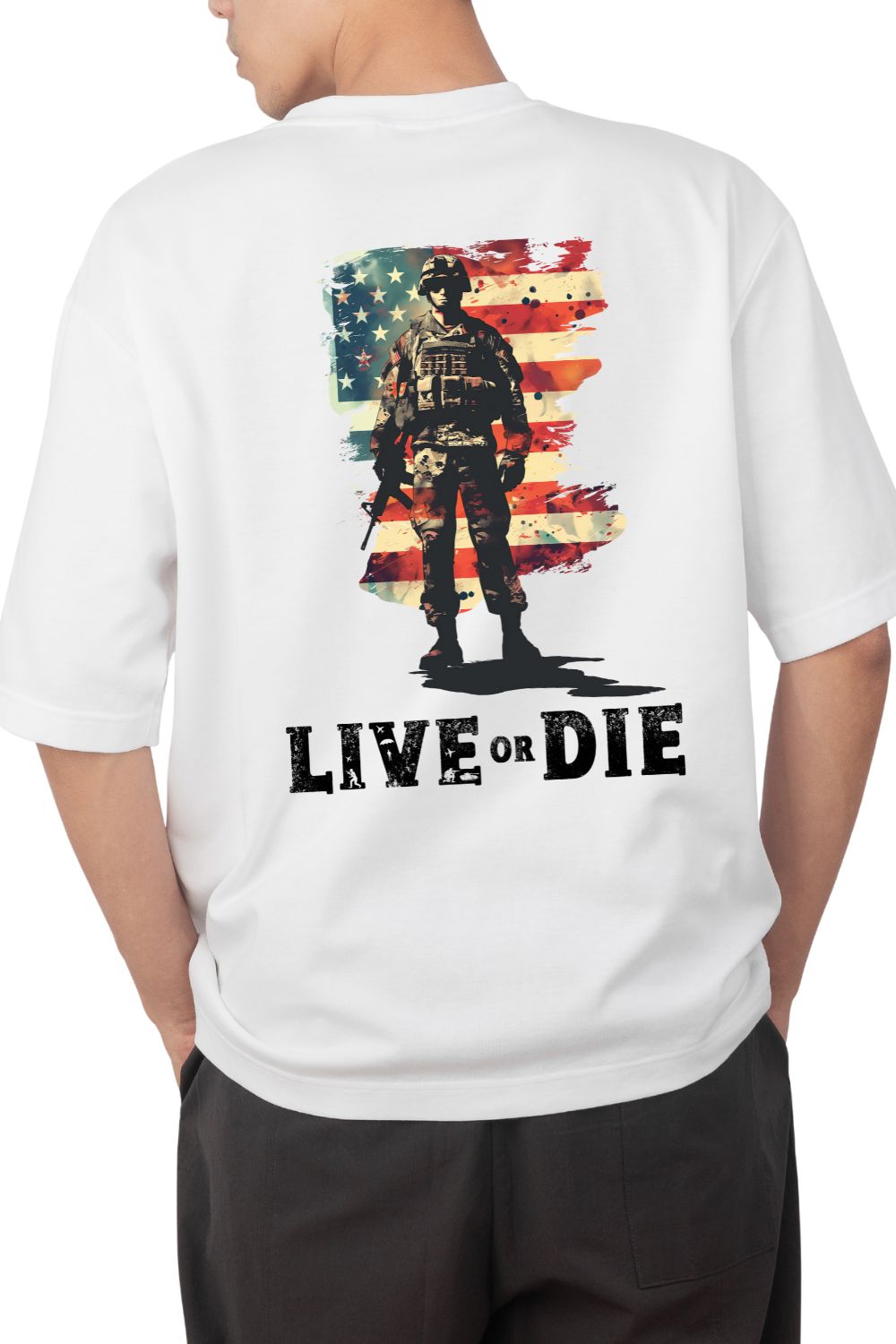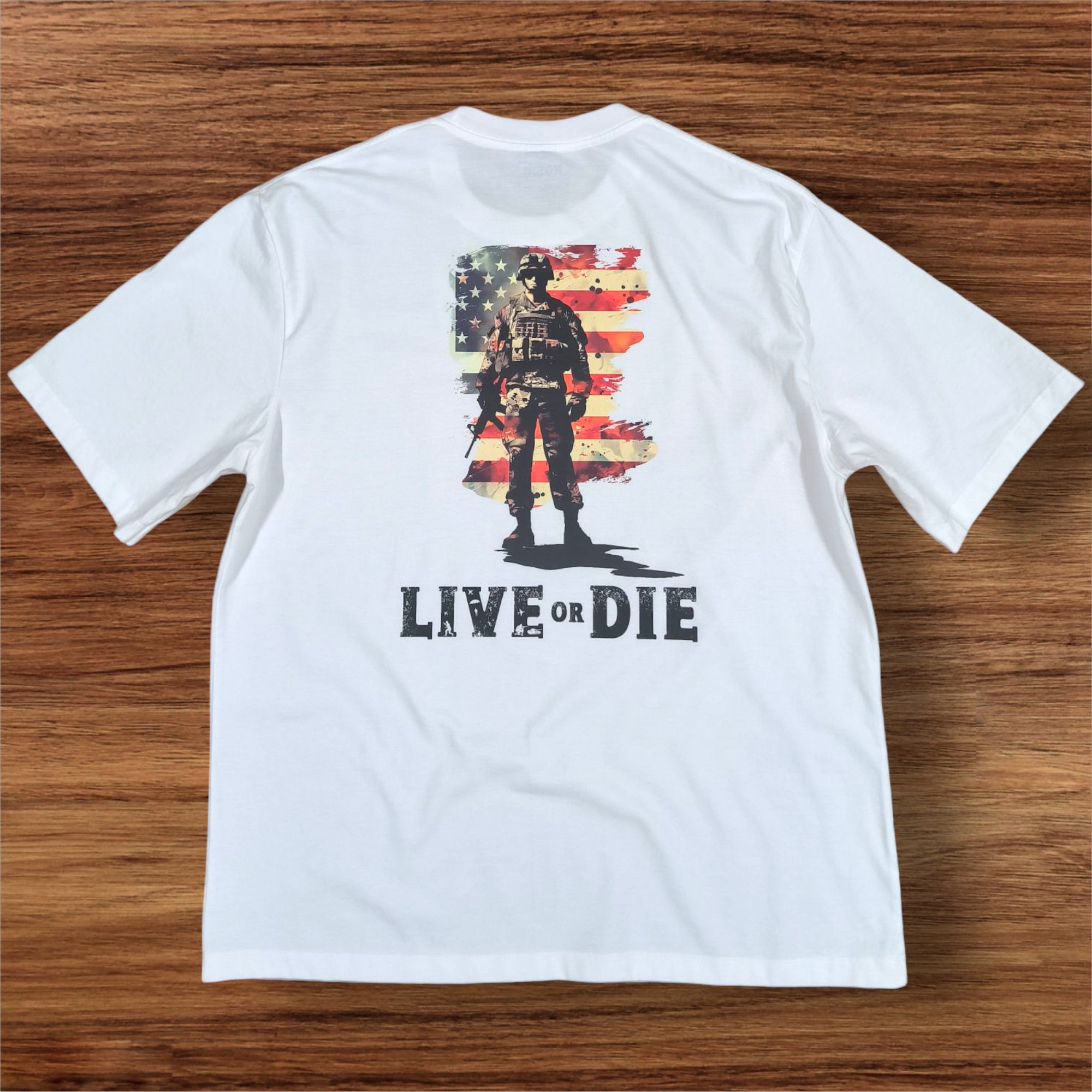 การรวมคำว่า “LIVE OR DIE” กับภาพทหารและธงชาติสร้างความรู้สึกของการต่อสู้เพื่อประเทศชาติ ความกล้าหาญและการเสียสละในช่วงเวลาที่สำคัญที่สุดในชีวิต. ทั้งหมดนี้สื่อถึงการต่อสู้ที่มีความเสี่ยงสูงและความภาคภูมิใจในการทำหน้าที่อย่างเต็มที่เพื่อปกป้องสิ่งที่รัก.